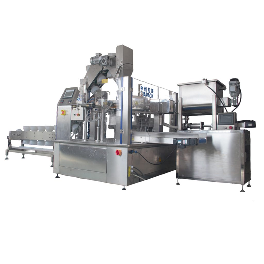 این دستگاه برای پر کردن محصول مایع مخلوط شده با محصول جامد مانند، پیش پخت مواد غذایی مانند ترشی با سوپ، زیتون ترشی، خیار شور و غیره طراحی شده است. دارای آسانسور کاسه ای برای تغذیه محصول جامد در کیسه از پیش ساخته شده و سپس پر کردن پمپ پیستونی سس .