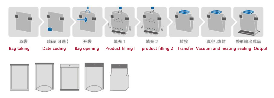 گردش کار: بسته بندی → تاریخ تولید چاپ → باز کردن کیسه → پر کردن 1 → پر کردن 2 → جای خالی → آب بندی حرارتی → شکل دهی و خروجی