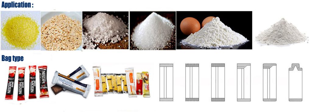 این دستگاه به طور عمده برای بسته بندی محصولات پودر استفاده می شود: مانند پودر شیر، پودر چای شیر، پودر قهوه، ادویه جات ترشی جات، پودر کاری، پودر پروتئین، ادویه، پودر گیاهی، محصولات پلاستیکی شیمیایی و پزشکی.