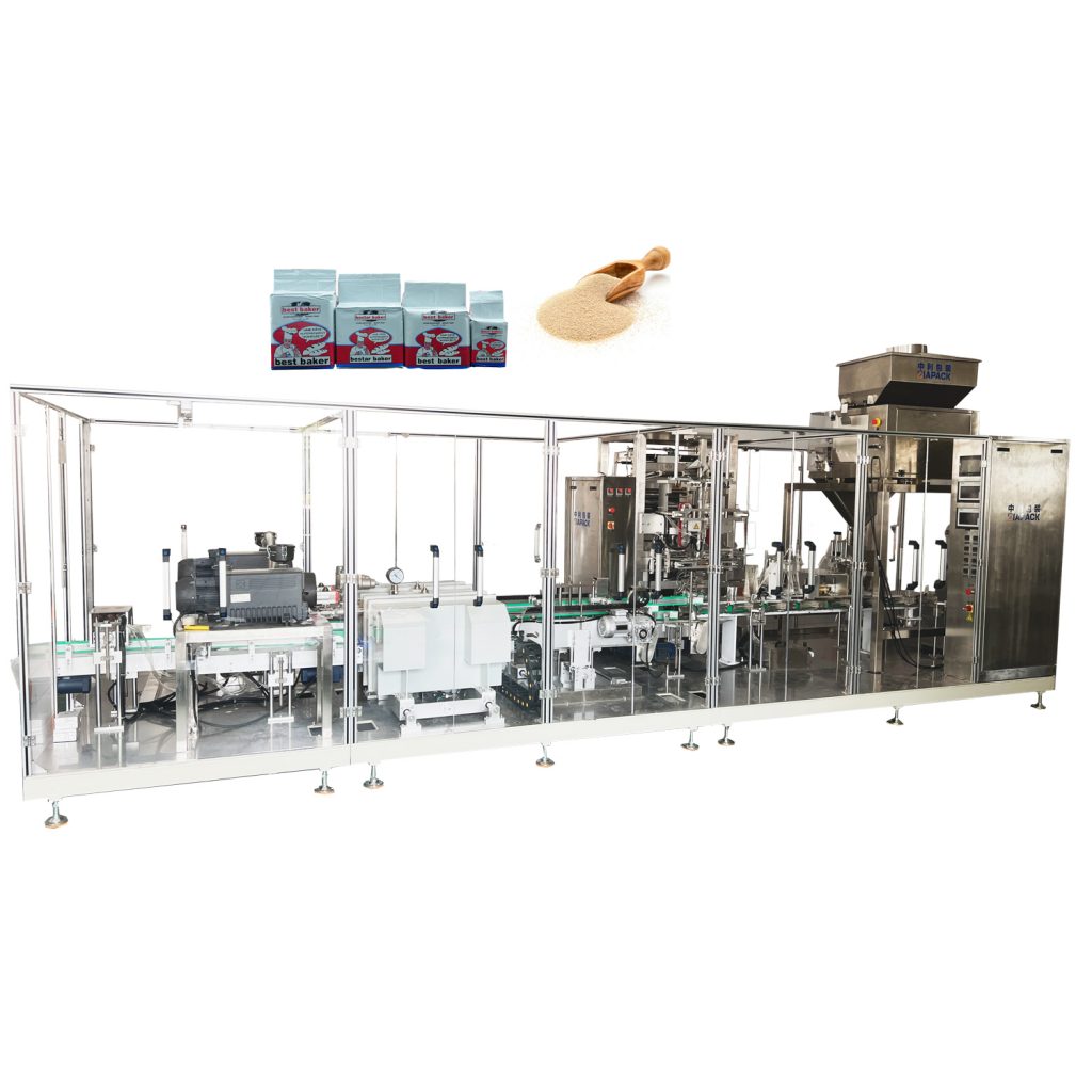 این دستگاه شامل یک دستگاه آسانسور خلاء ZK3 برای تغذیه مخمر خشک، یک مجموعه دستگاه بسته بندی و آب بندی کیسه سازی عمودی ZL520. یک دستگاه توزین چهار سطلی ZLC4-2000، دستگاه بسته بندی دو محفظه خلاء ZL-100V2 یک مجموعه. این دستگاه به طور گسترده ای برای بسته بندی مواد شیمیایی داروخانه مواد غذایی و سایر محصولات در پودر یا گرانول کوچک استفاده می شود. مانند پودر قهوه، پودر مخمر آرد گندم و غیره. درجه خلاء بسیار بالا است و سرعت بسته بندی بسیار بالا می تواند به 30 کیسه در دقیقه برسد. محصول نهایی ماندگاری طولانی و شکل زیبایی دارد.